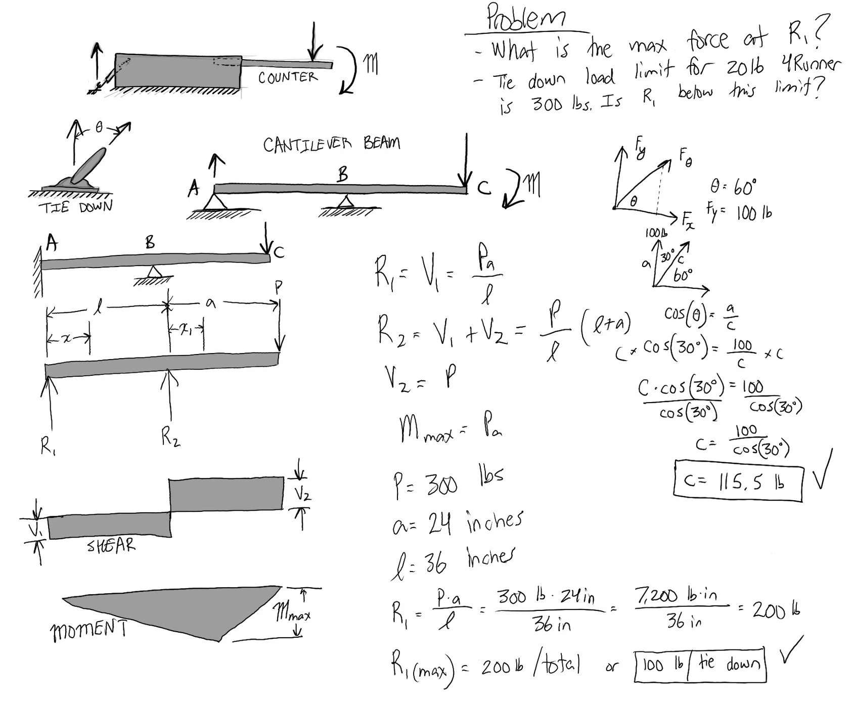 Performing statics calculations to ensure the maximum force applied to the 4Runner trunk tie downs was within it’s design limits. The maximum 300 lb. force applied to the countertop was found to be acceptable for the trunk tie downs.