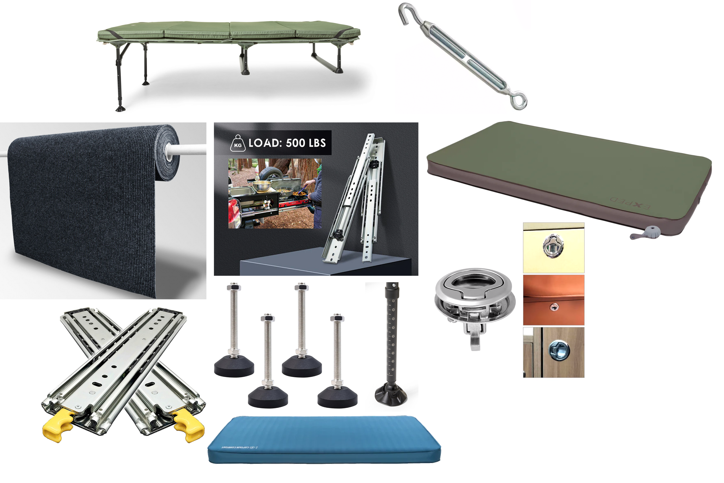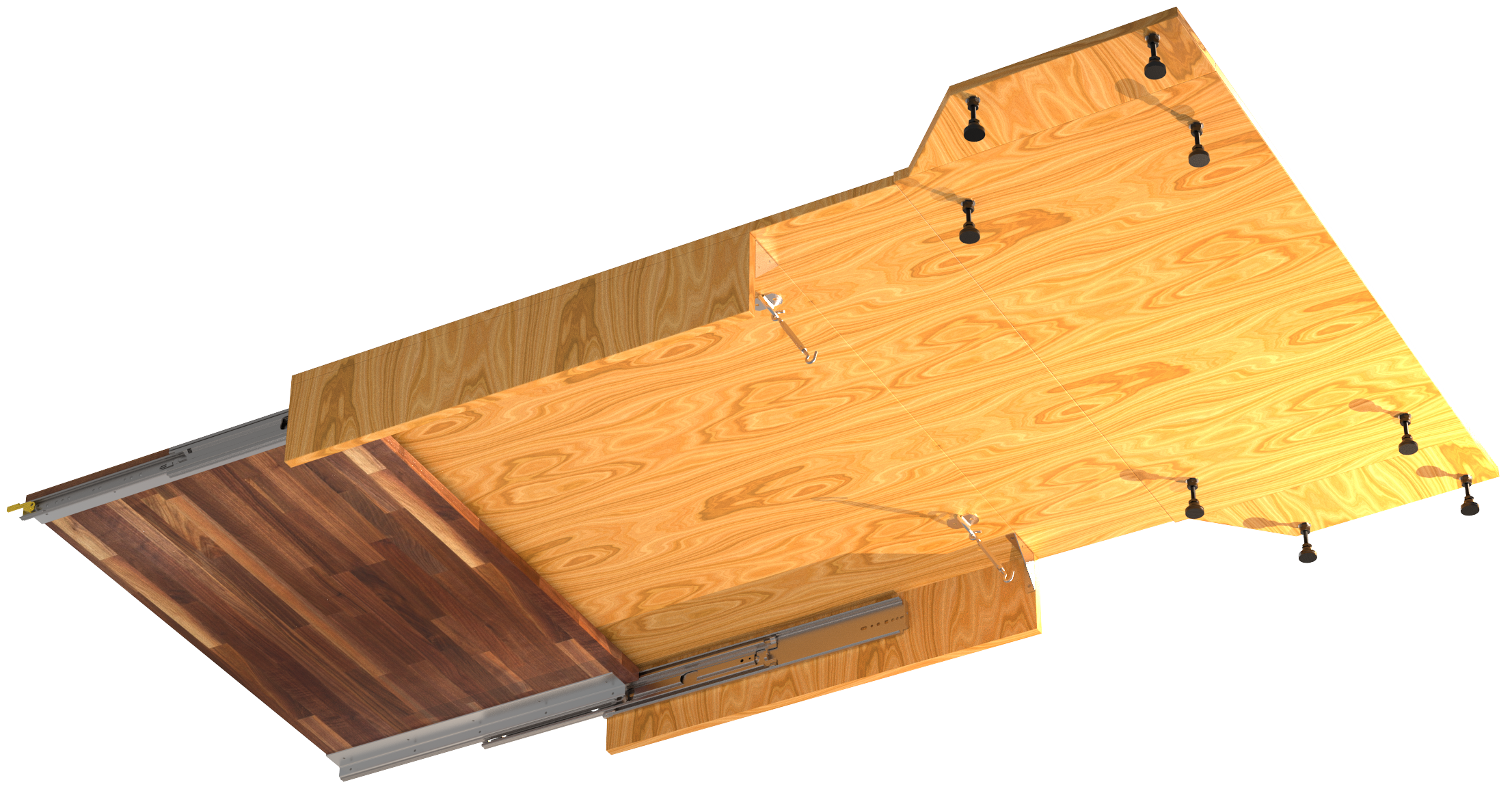 Using hardware found in RV’s and heavily rigged drawers sparked inspiration. Since the rear seat seat-backs are uneven when collapsed, I knew I was going to have to utilize adjustable multi-directional pivoting legs to support the sleeping platform.