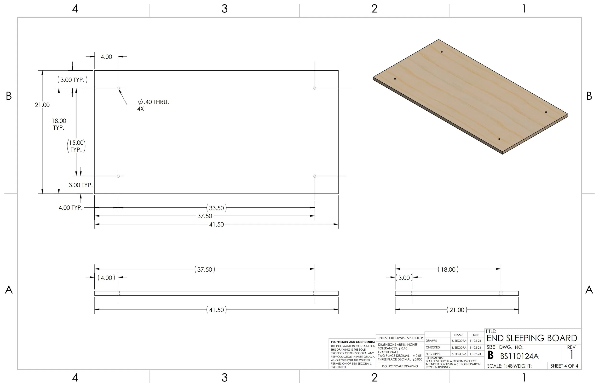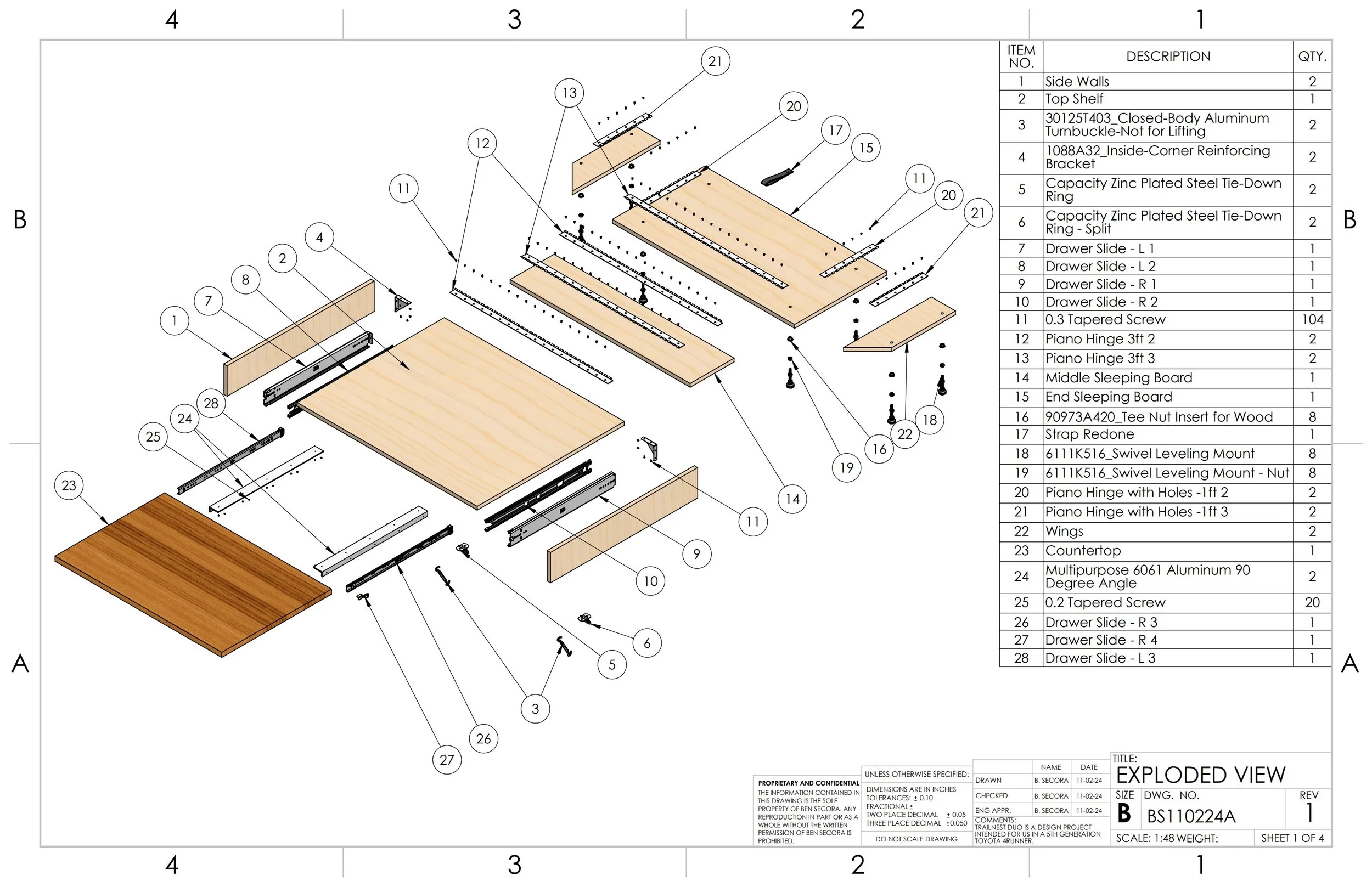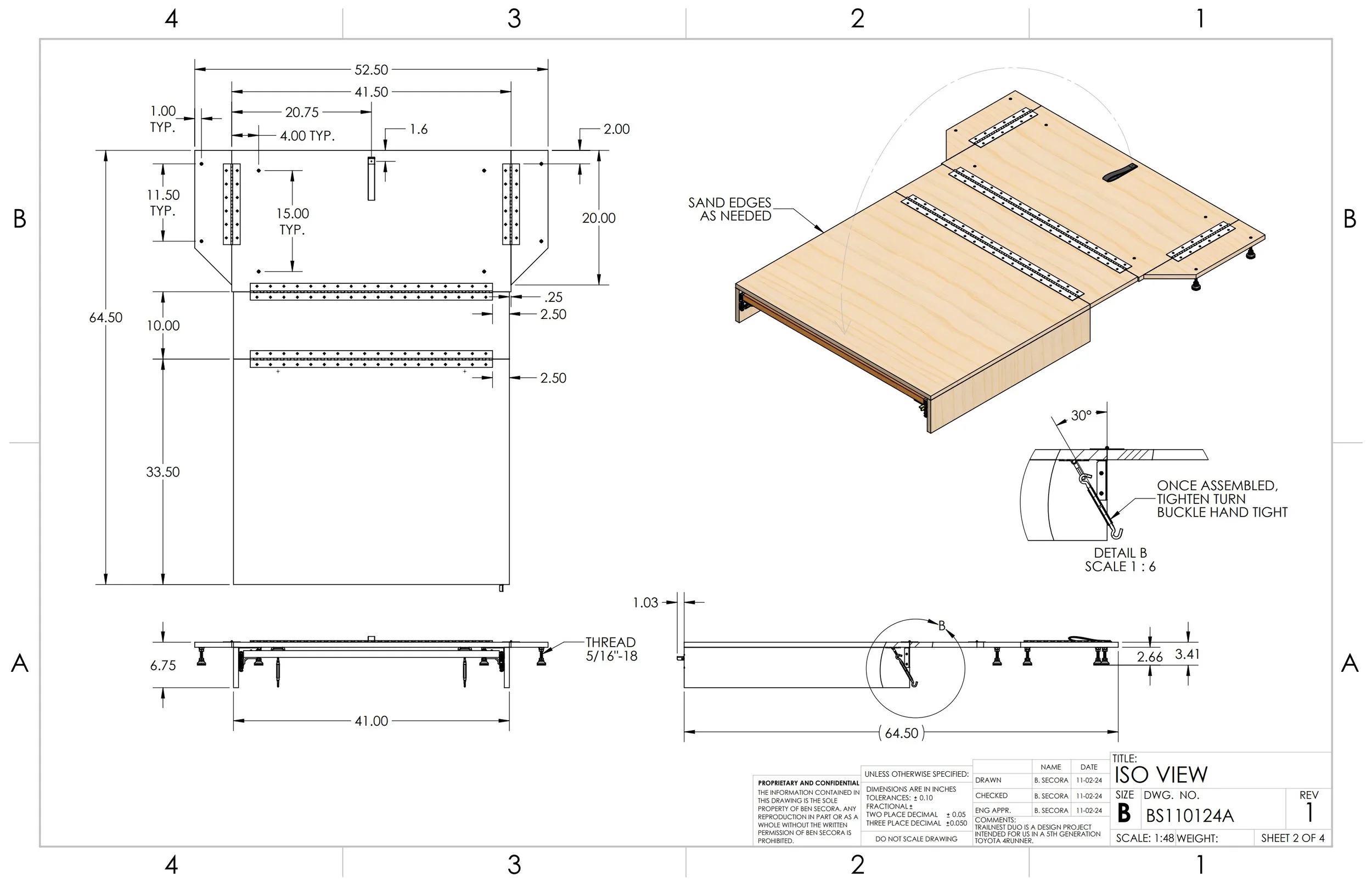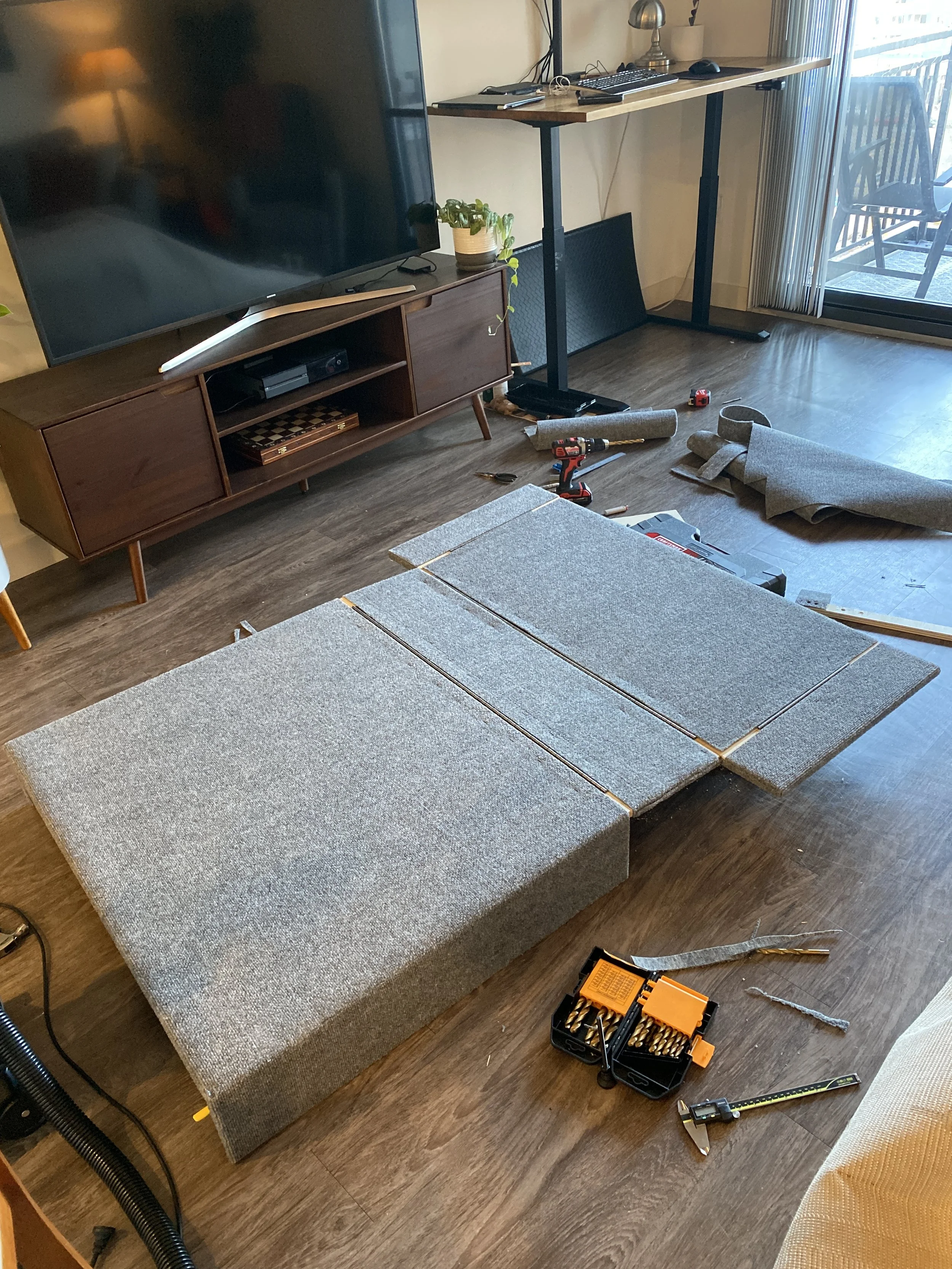 Building the TrailNest Duo was difficult in my one bedroom apartment with limited tools and space. I printed off the SolidWorks drawings and utilized a local co-working wood shop to cut the wood components using their table and track saws. My floor and kitchen became my workshop.