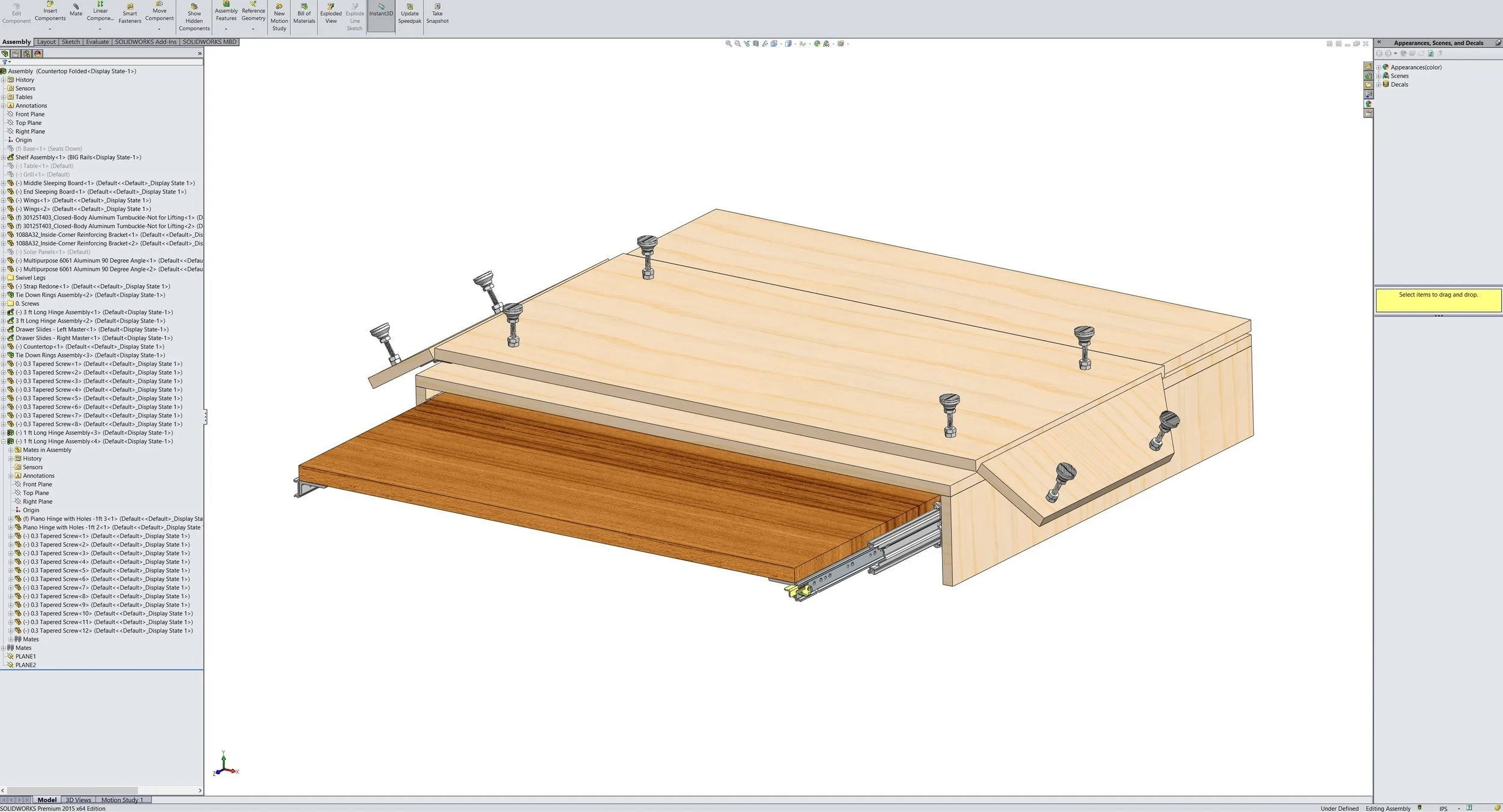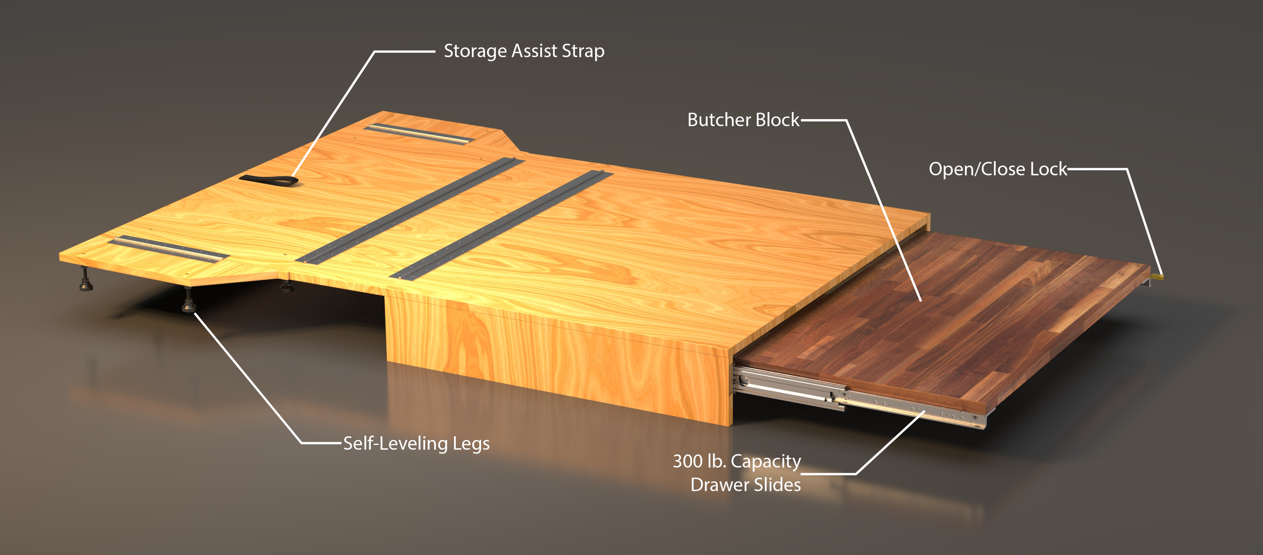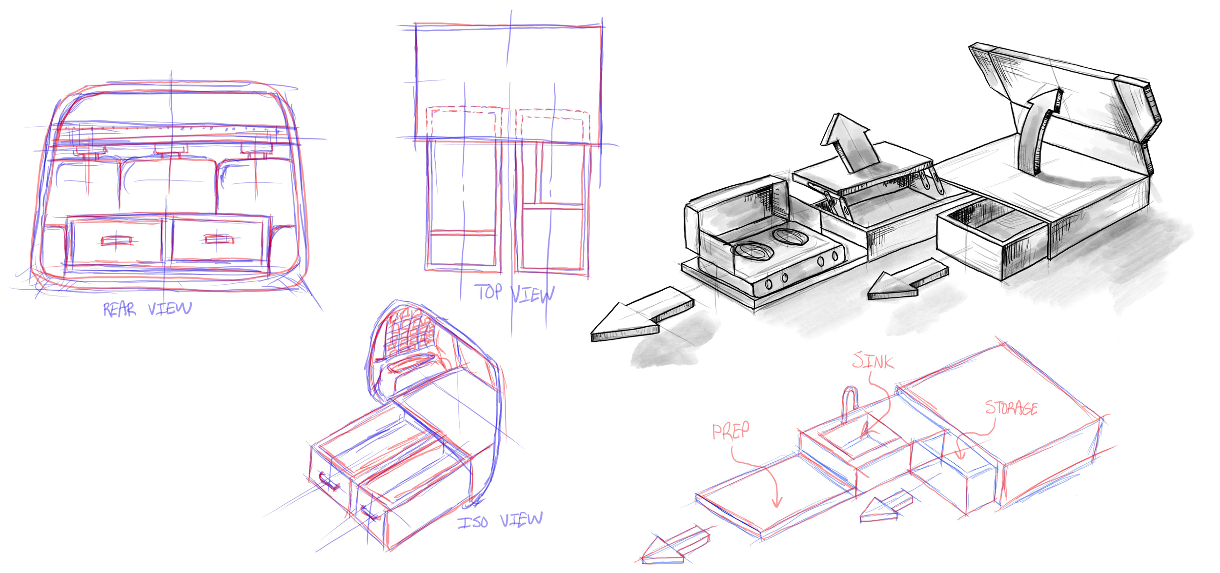 Manually installing the legs is the most time consuming part of the setup/teardown process so if the legs could automatically fold out/retract on their own, it could save ample time. I explored several leg designs throughout the initial process, but due to the restrictions of budget and time, they were postponed. Shallow drawers could be added above or below the countertop to add storage, but it would compromise on precious trunk space.