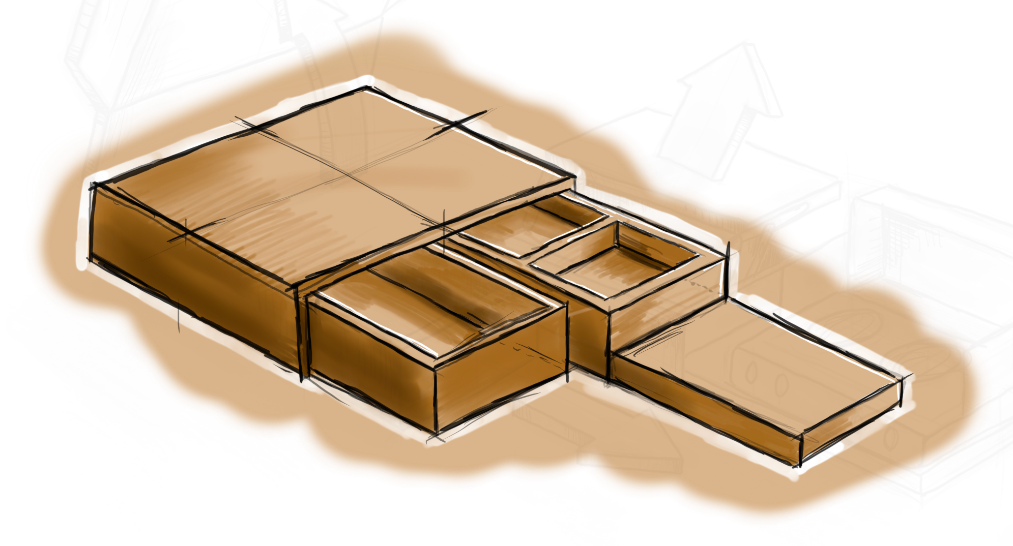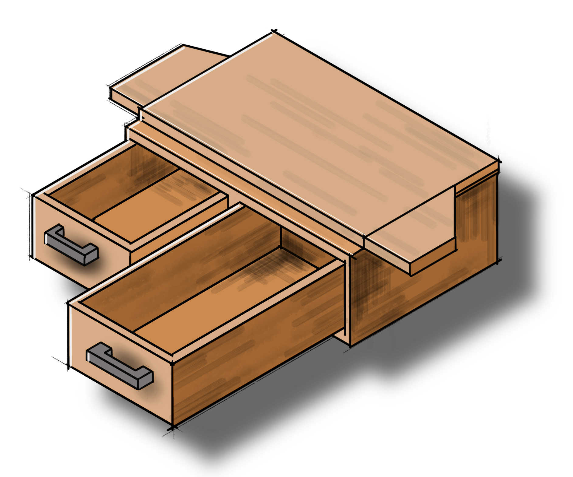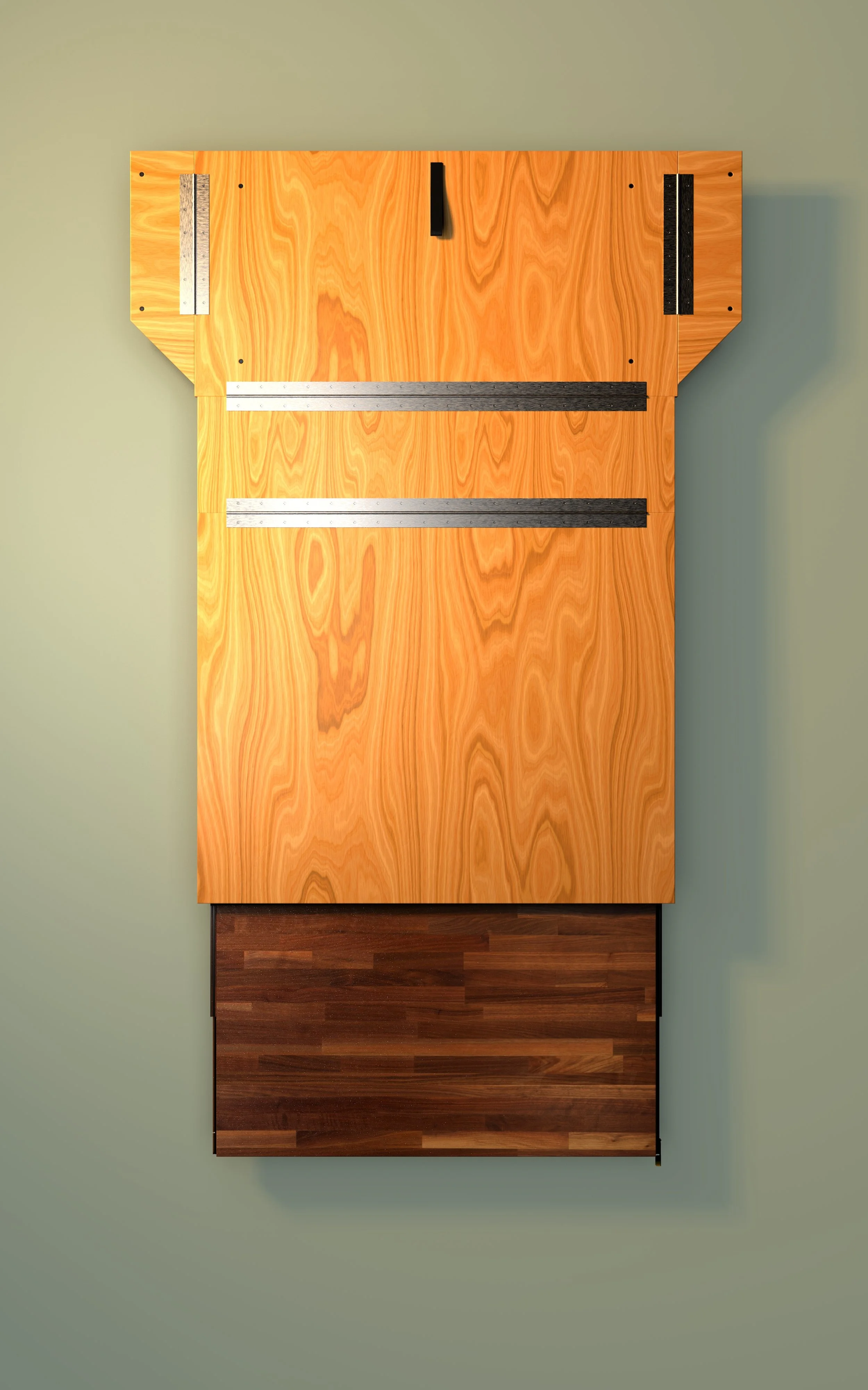 Manually installing the legs is the most time consuming part of the setup/teardown process so if the legs could automatically fold out/retract on their own, it could save ample time. I explored several leg designs throughout the initial process, but due to the restrictions of budget and time, they were postponed. Shallow drawers could be added above or below the countertop to add storage, but it would compromise on precious trunk space.