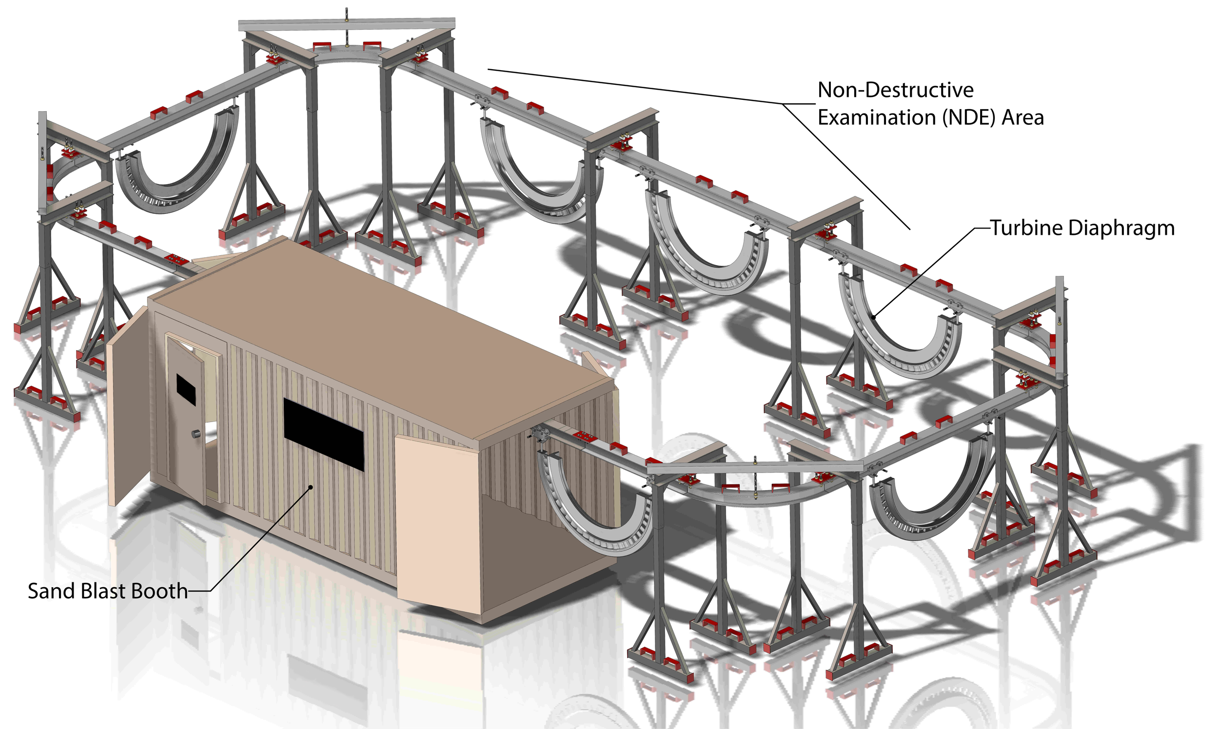 My first design project out of college was to create a monorail system that could combine the sand blasting and non-destructive examination (NDE) inspection of incoming steam turbine diaphragms into one. Sand blasting and NDE are standard processes for steam turbine maintenance.